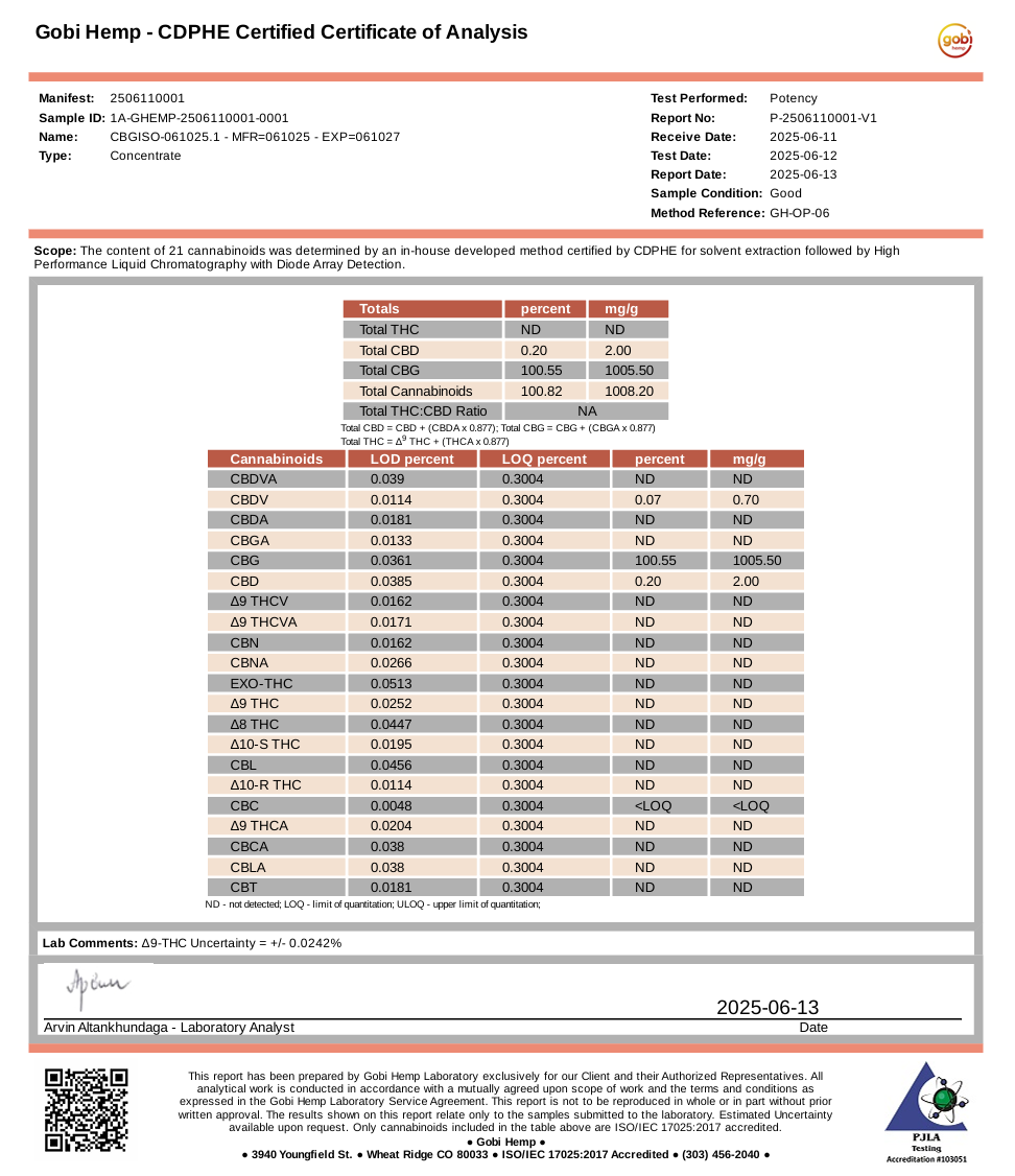 Experience the highest purity with our CBG isolate, containing over 99% pure CBG.